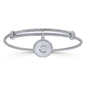 Adjustable Twisted Cable Stainless Steel Bangle with Sterling Silver C Initial Charm