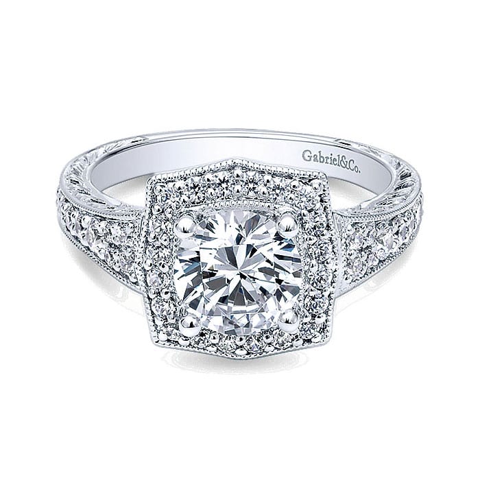 14K White Gold Channel and Hand Cut Etched Round Halo Diamond 14K White Gold Engagement Ring ER10191W44JJ