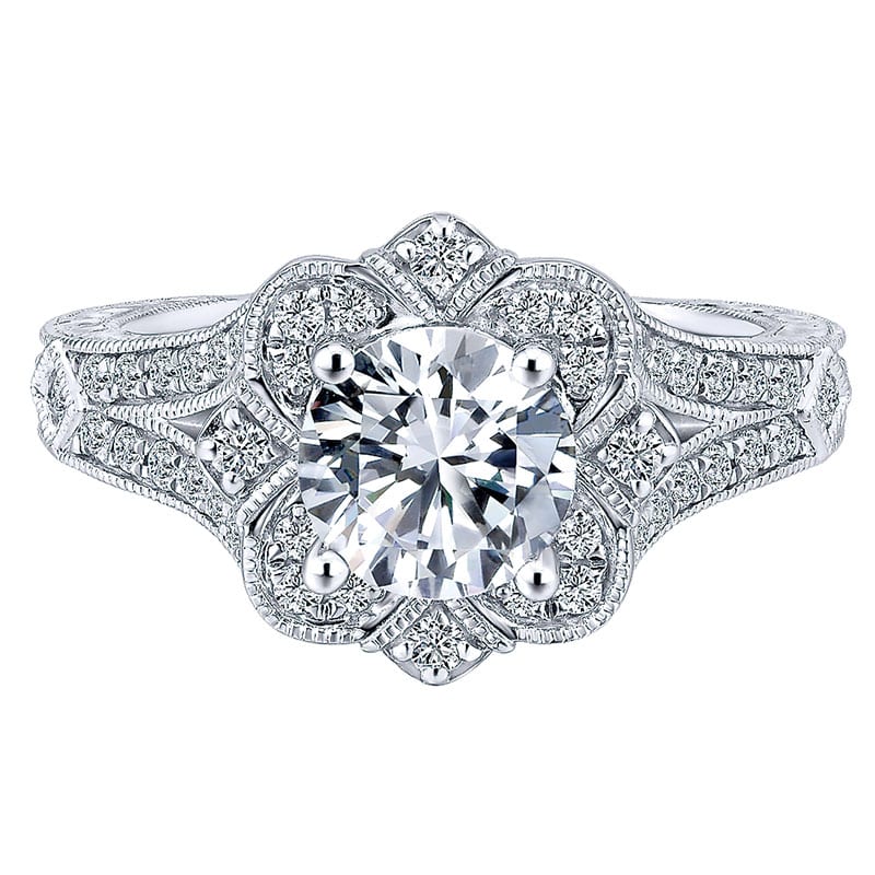 14k White Gold Diamond Flower Halo With Hand Etched Shank Engagement Ring ER11963W44JJ