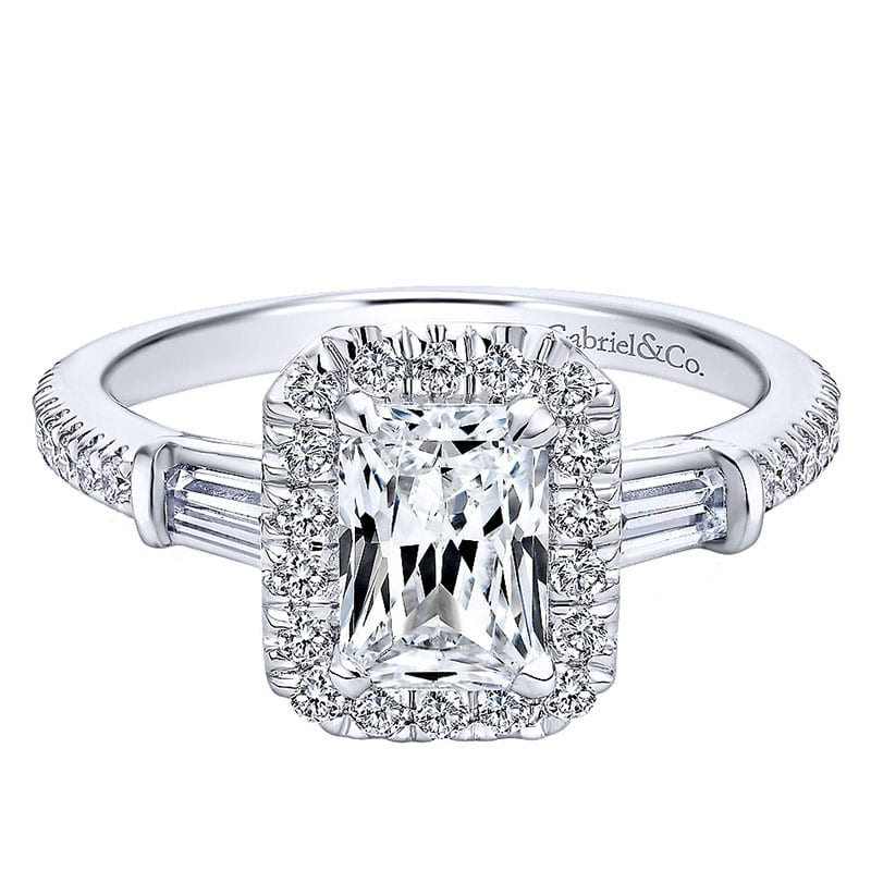 14K White Gold Diamond Pave Emerald Cut Halo With Bar Baguette Setting 14K White Gold Engagement Ring ER7268W44JJ