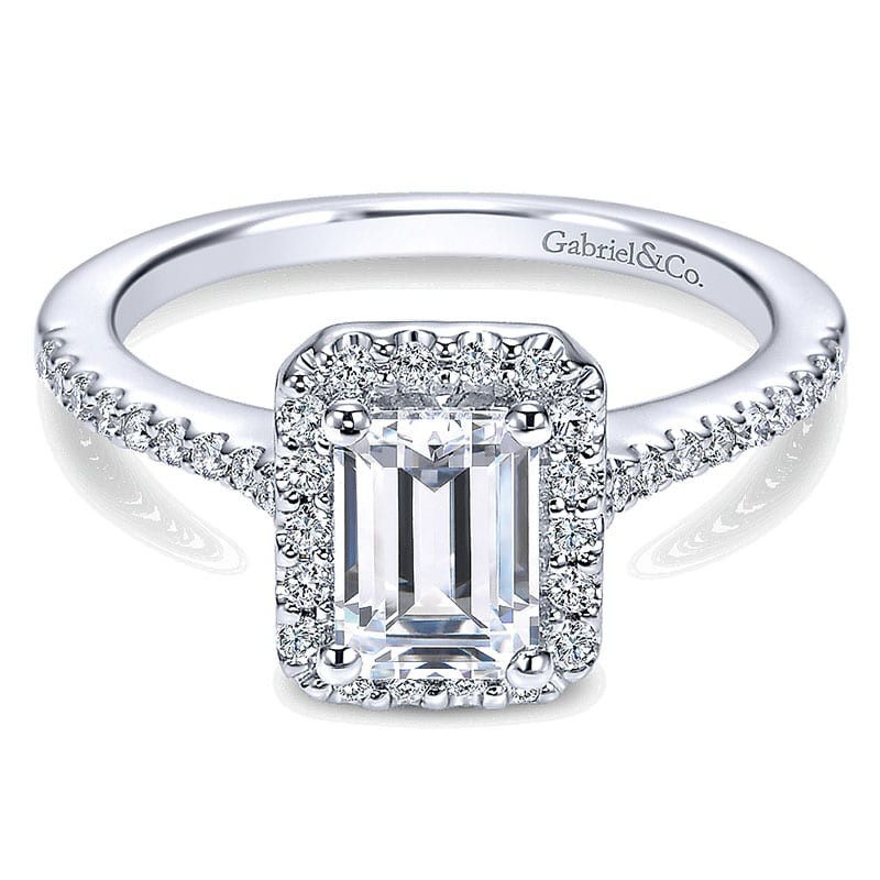 14K White Gold Emerald Cut Diamond Halo With Pave Shank 14K White Gold Engagement Ring ER5822W44Jj