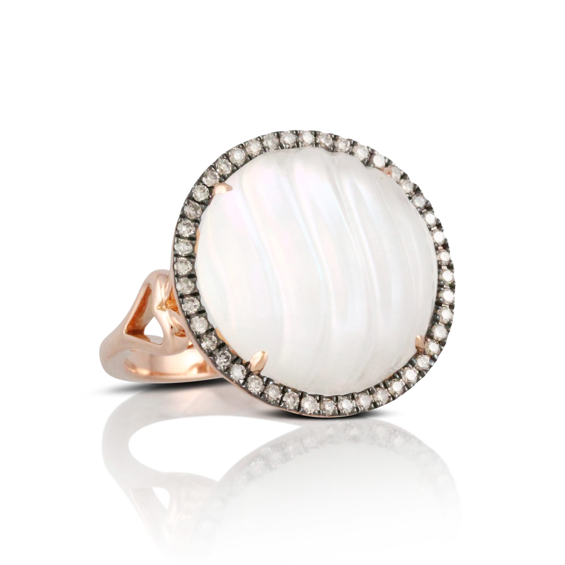 18k Rose Gold Diamond Ring With Brown And White Diamond With Carved Clear Quartz Over White Mother Of Pearl