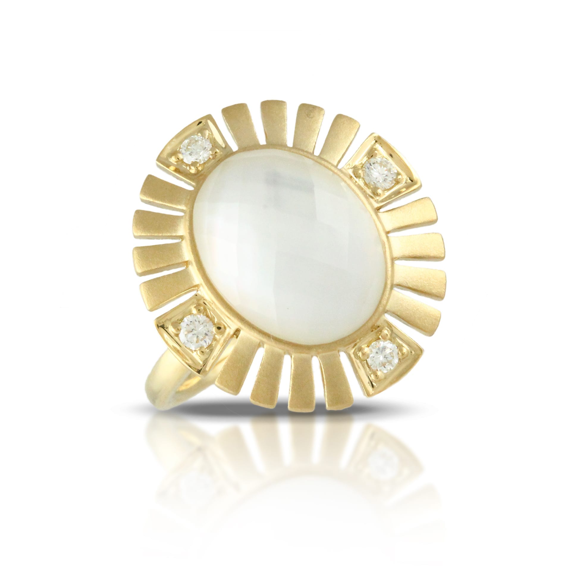 18k Yellow Gold Burst With Diamond Accents Circle Clear Quartz Over White Mother Of Pearl Ring