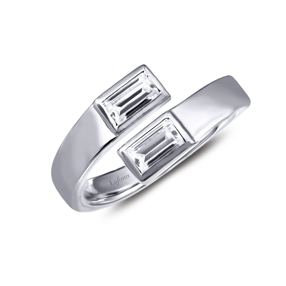 A symbol of your enduring love and friendship classy designer ring features two clear baguette simulated diamonds nestled side-by-side on the diagonal in sterling silver bonded with platinum