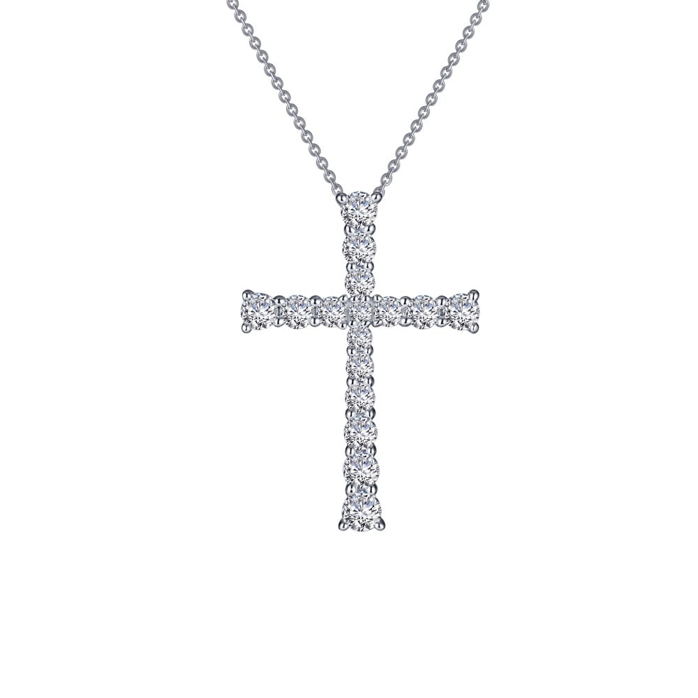A timeless classics cross pendant is set with simulated diamonds in sterling silver bonded with platinum The pendant comes on an adjustable 18 inch chain