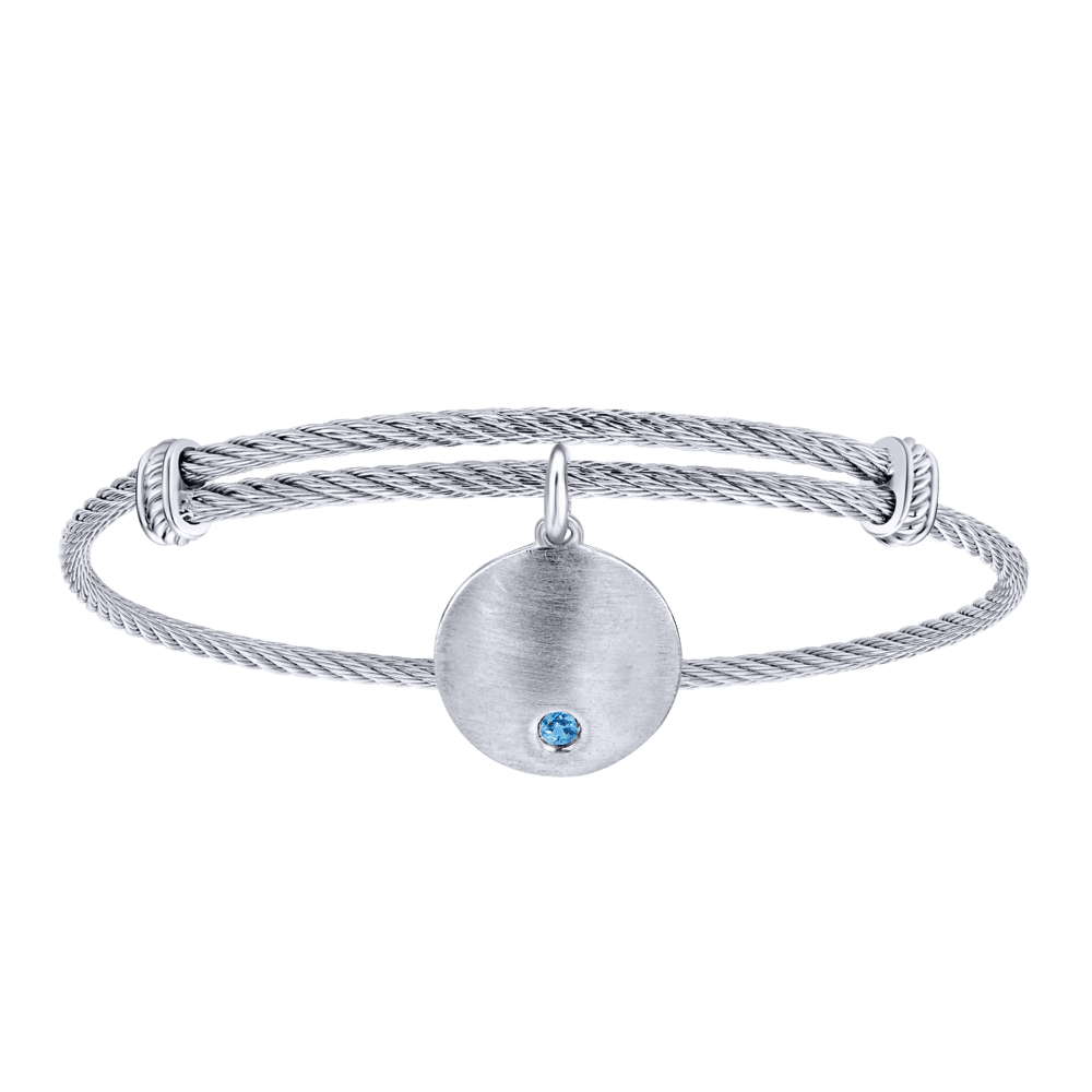 Adjustable Stainless Steel Bangle with Round Sterling Silver Blue Topaz Stone Disc Charm