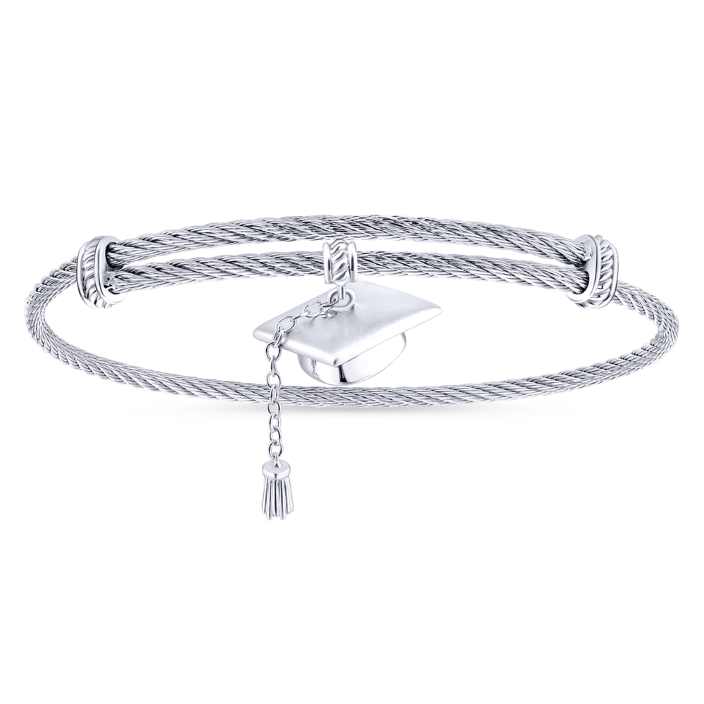 Adjustable Stainless Steel Twisted Cable Bangle with Silver Graduation Cap Charm