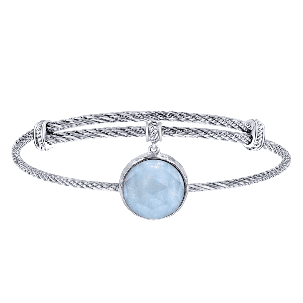 Adjustable Twisted Cable Stainless Steel Bangle with Round Sterling Silver Rock Crystal/Blue Jade Charm