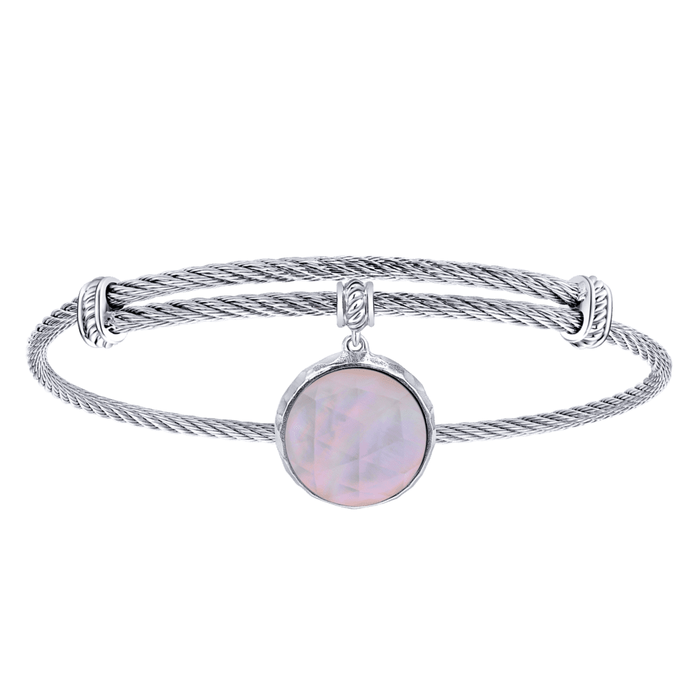Adjustable Twisted Cable Stainless Steel Bangle with Round Sterling Silver Rock Crystal/Pink MOP Charm