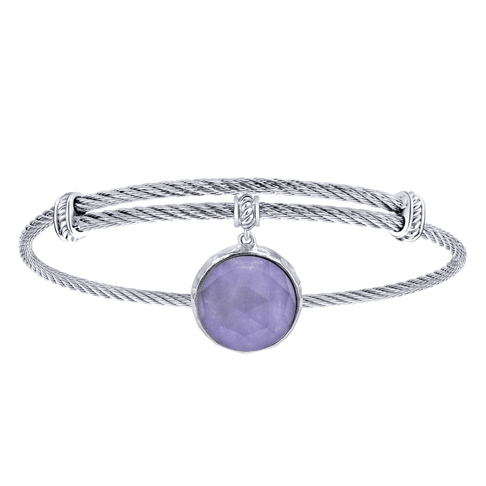 Adjustable Twisted Cable Stainless Steel Bangle with Round Sterling Silver Rock Crystal/Purple Jade Charm