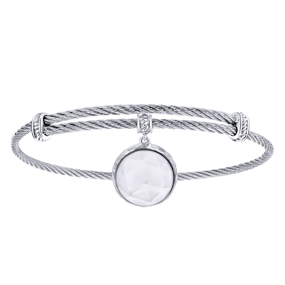 Adjustable Twisted Cable Stainless Steel Bangle with Round Sterling Silver Rock Crystal/White Agate Charm