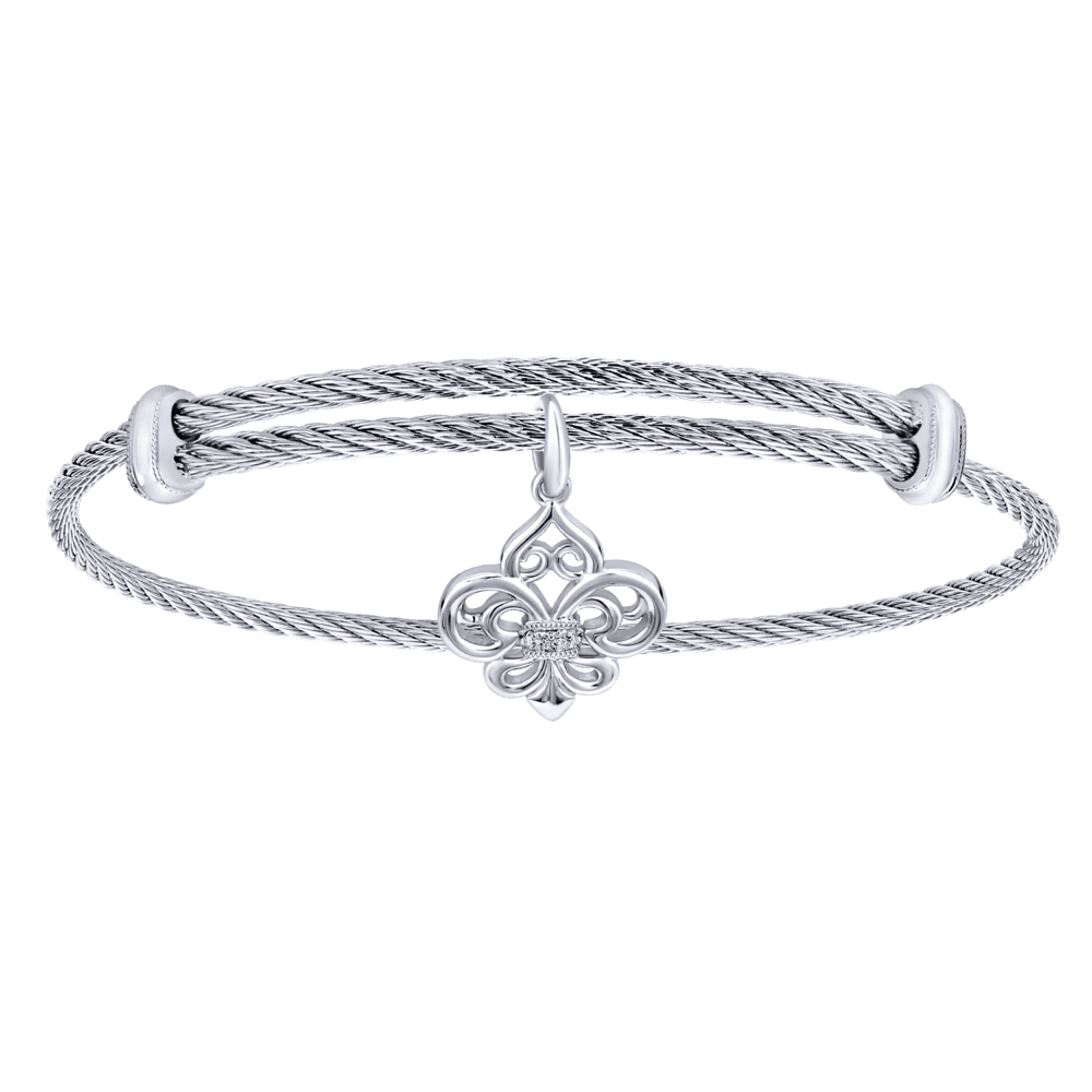 Adjustable Twisted Cable Stainless Steel Bangle with Sterling Silver Diamond Fleur de Lis Charm