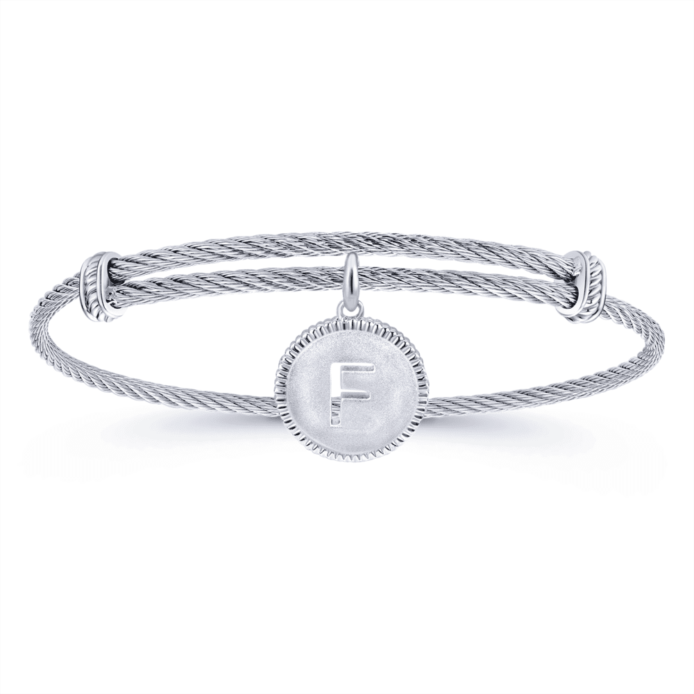 Adjustable Twisted Cable Stainless Steel Bangle with Sterling Silver F Initial Charm
