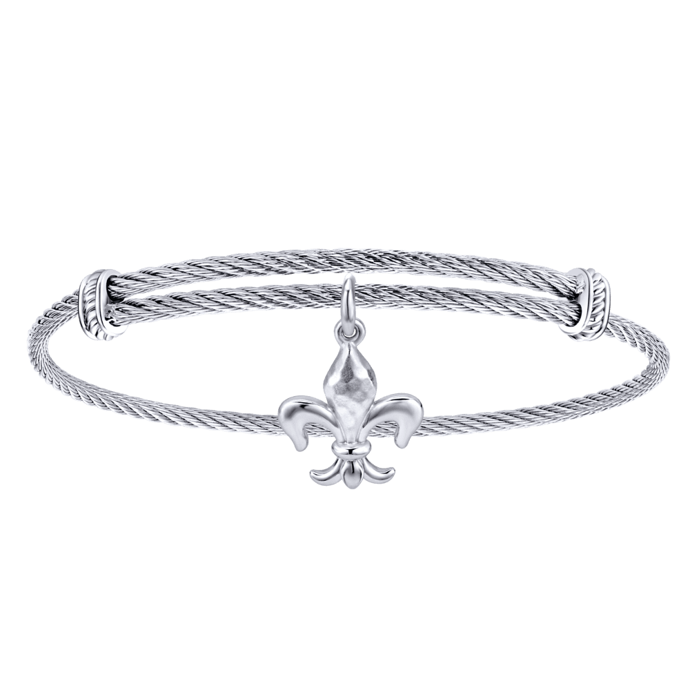 Adjustable Twisted Cable Stainless Steel Bangle with Sterling Silver Fleur de Lis Charm