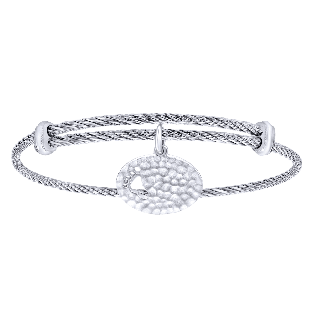 Adjustable Twisted Cable Stainless Steel Bangle with Sterling Silver Hammered Footprint Charm