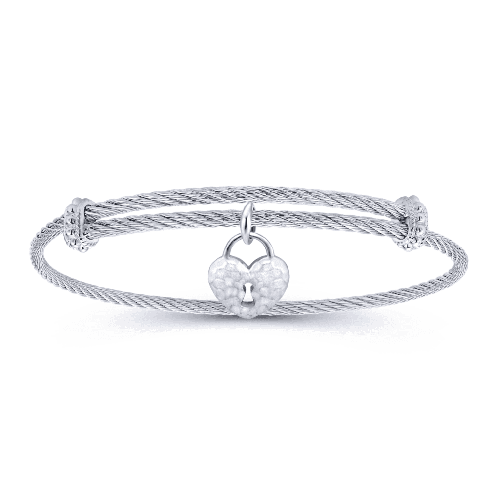 Adjustable Twisted Cable Stainless Steel Bangle with Sterling Silver Heart Lock Charm