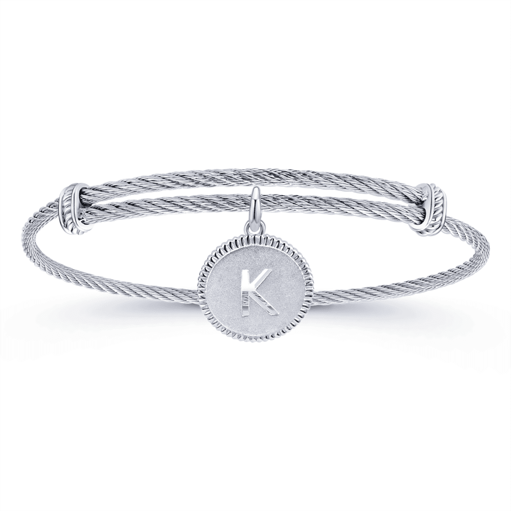 Adjustable Twisted Cable Stainless Steel Bangle with Sterling Silver K Initial Charm
