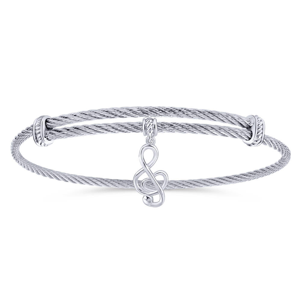 Adjustable Twisted Cable Stainless Steel Bangle with Sterling Silver Music Note Charm