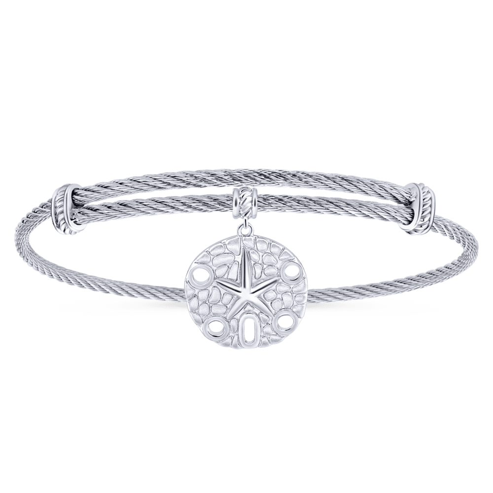 Adjustable Twisted Cable Stainless Steel Bangle with Sterling Silver Sand Dollar Charm
