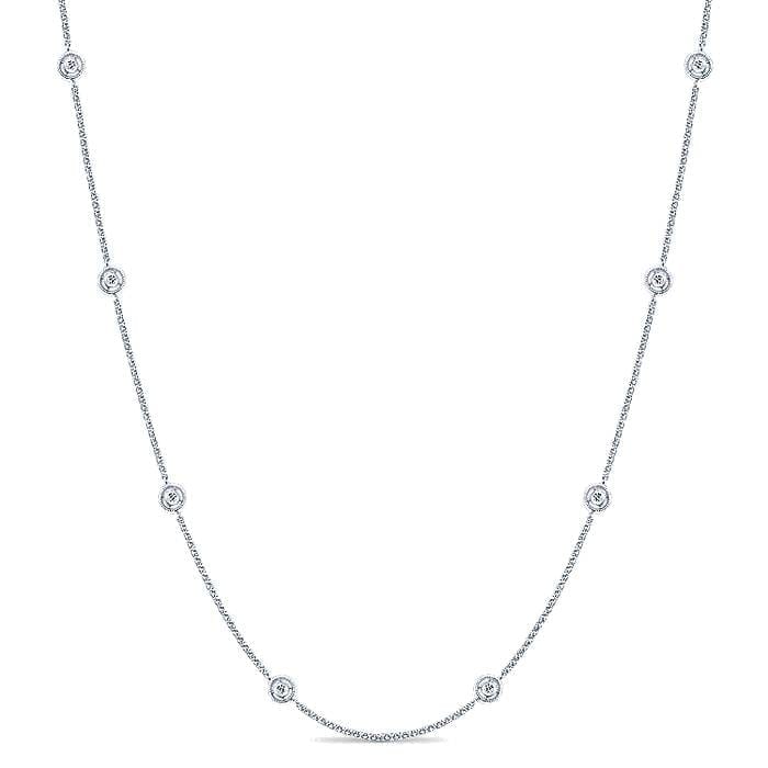 Bezel Set Round Diamonds Suspended Within Elegant Milgrain Frames on 14k White Gold Station Necklace