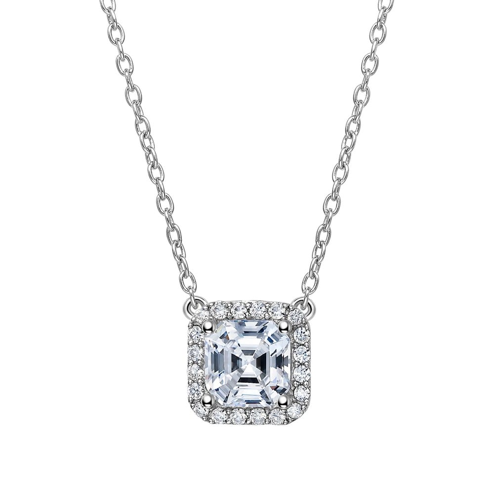 Breathtaking brilliance Asscher-cut halo necklace is set with simulated diamonds in sterling silver bonded with platinum