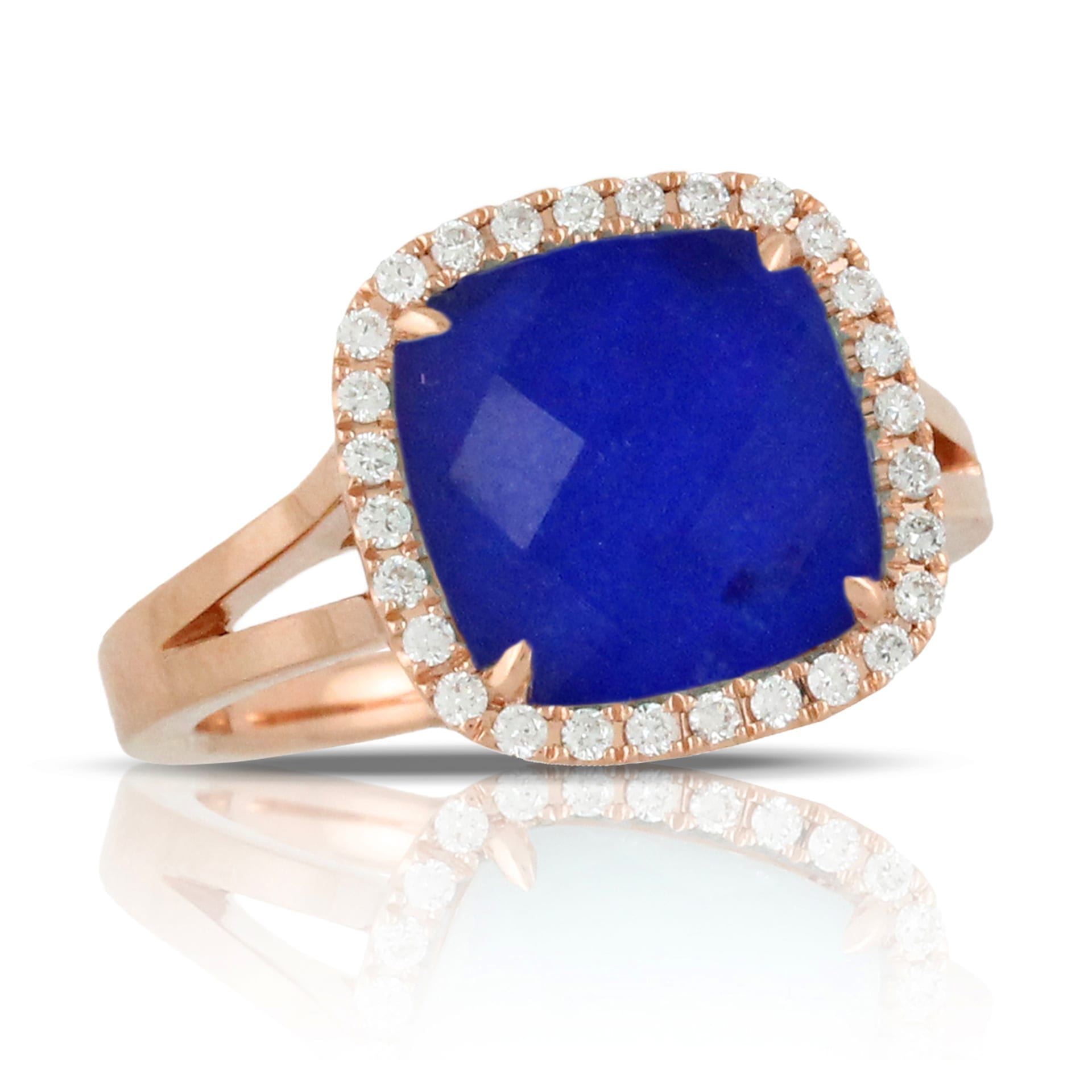 Checkered Cushion Cut Clear Quartz Over Lapis With Diamond Halo on 18k Rose Gold Ring