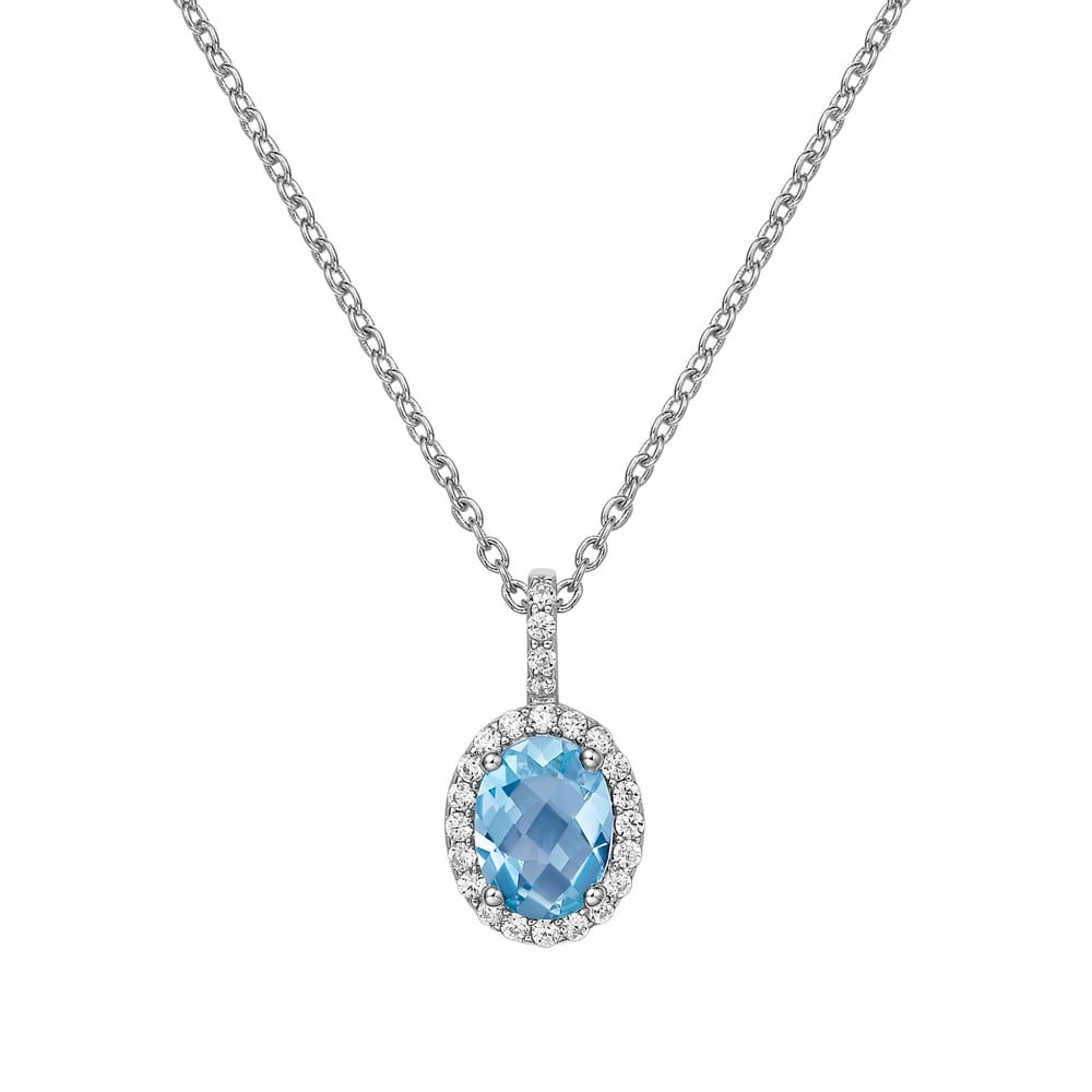 Classic Aria pendant set with a genuine oval checkerboard-cut blue topaz surrounded by simulated diamonds in sterling silver bonded with platinum The pendant comes on an adjustable 18 inch chain