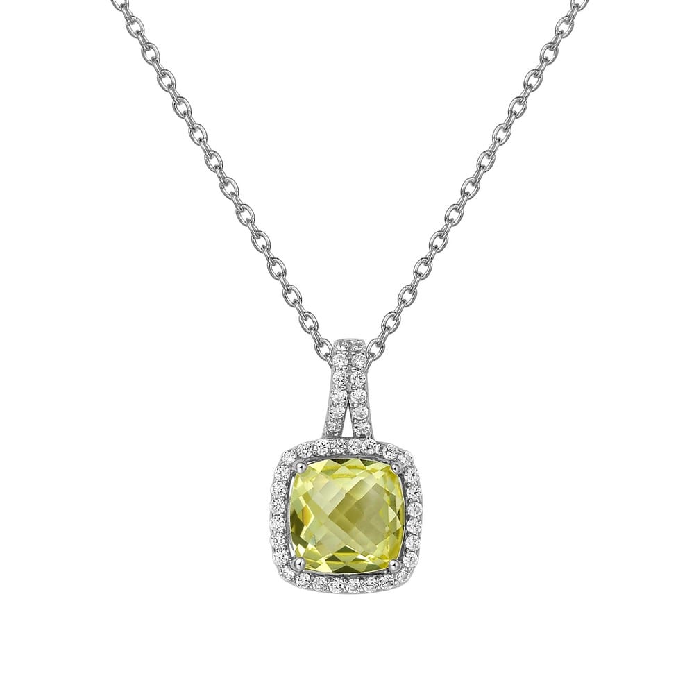 Classic Aria pendant set with a genuine square cushion checkerboard-cut lemon quartz surrounded by simulated diamonds in sterling silver bonded with platinum The pendant comes on an adjustable 18 inch chain