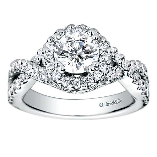Criss Crossing Flowing Strands of Diamonds And Center Halo in 14k White Gold Engagement Ring Setting