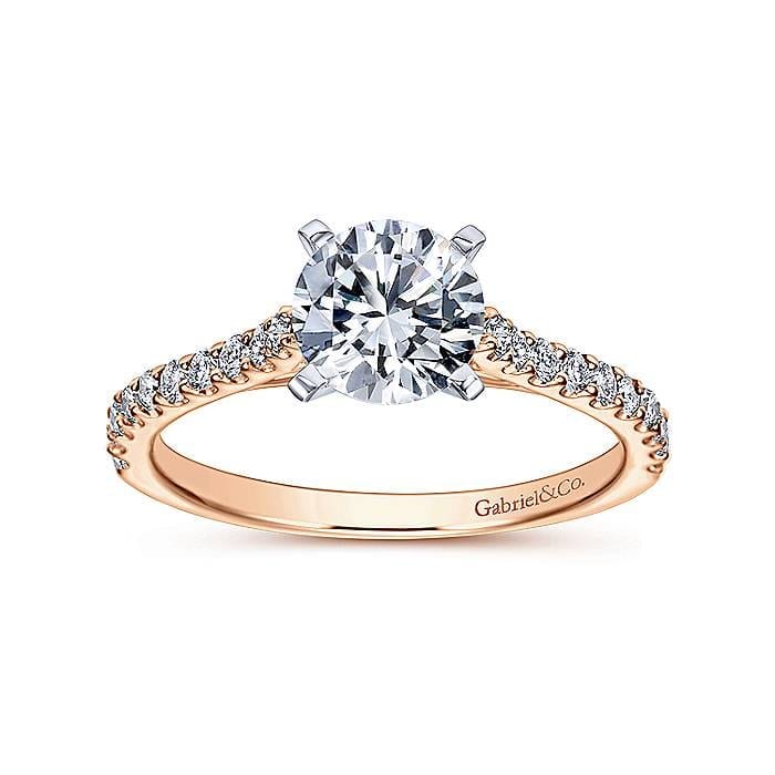Diamond Encrusted 14k Pink Gold Frames Round Center Set in 14k White Gold Engagement Ring Setting