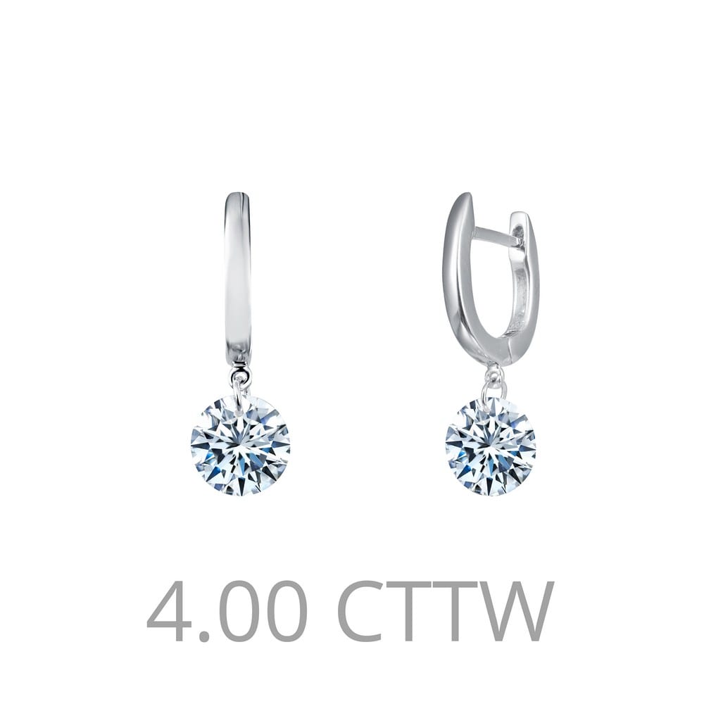Each of these frameless earrings features a two-carat simulated diamond dangled from an English lock setting in sterling silver bonded with platinum combined with 14-karat gold components