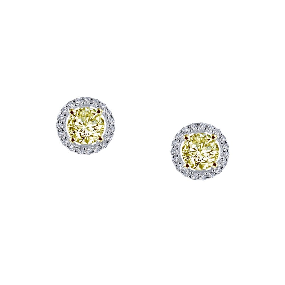 Each of these halo earrings feature a canary simulated diamond set in yellow gold plated prongs surrounded by round simulated diamonds in sterling silver bonded with platinum