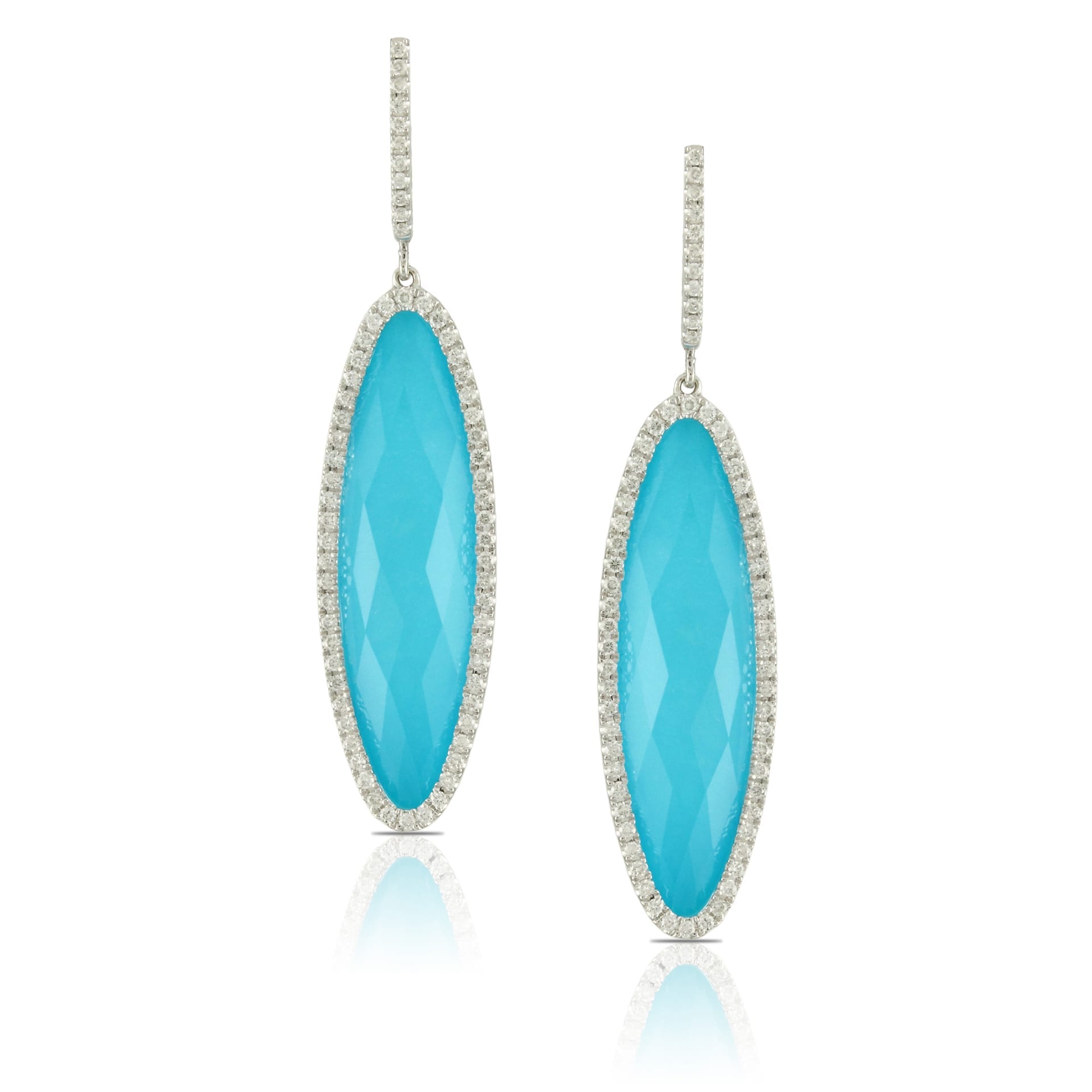 Elongated 18k White Gold Diamond Earring With Clear Quartz Over Turqouise