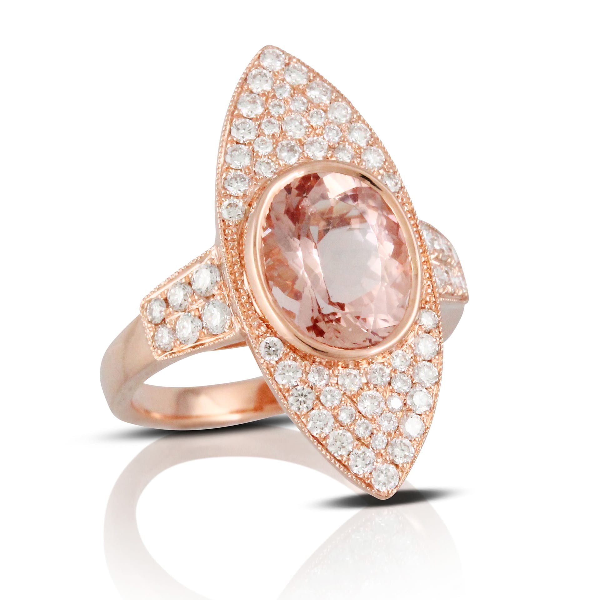 Eye Shaped Ring Covered in Diamonds Set in 18k Rose Gold With Striking Morganite Center