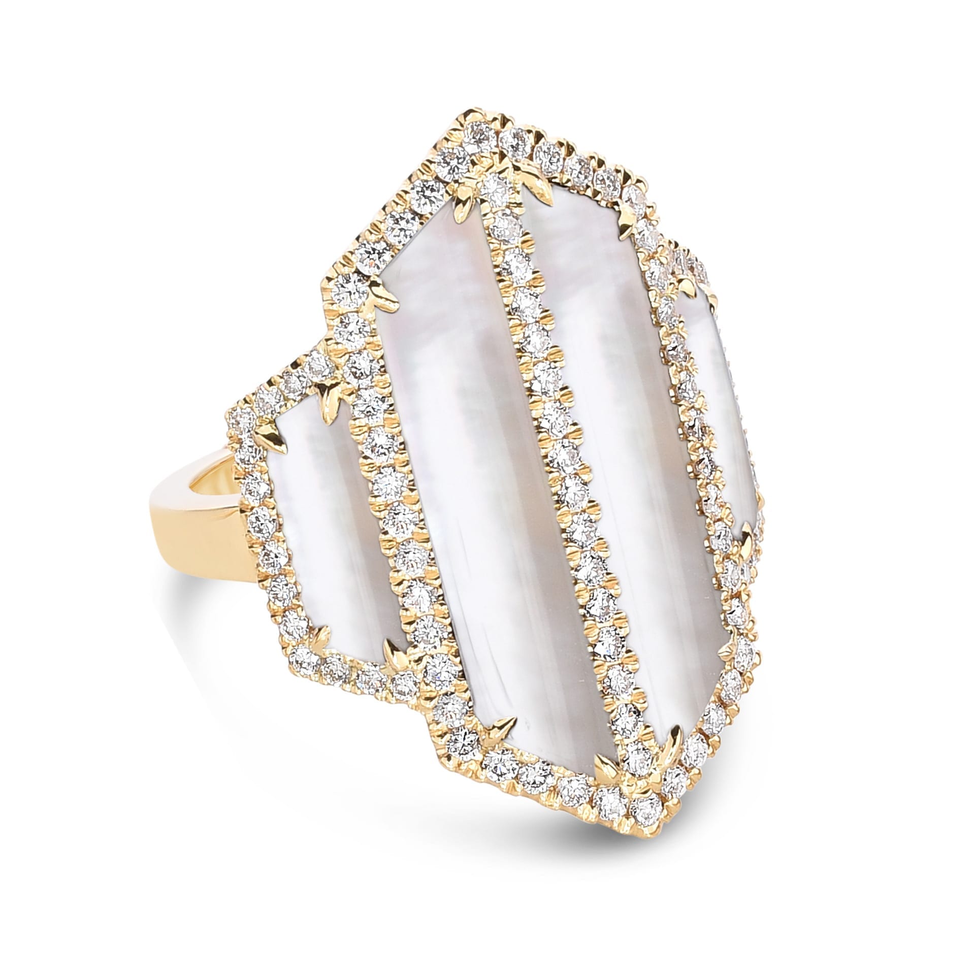 Four Clear Quartz Over White Mother Of Pearl Stones Surrounded By Diamonds in 18k Yellow Gold Ring