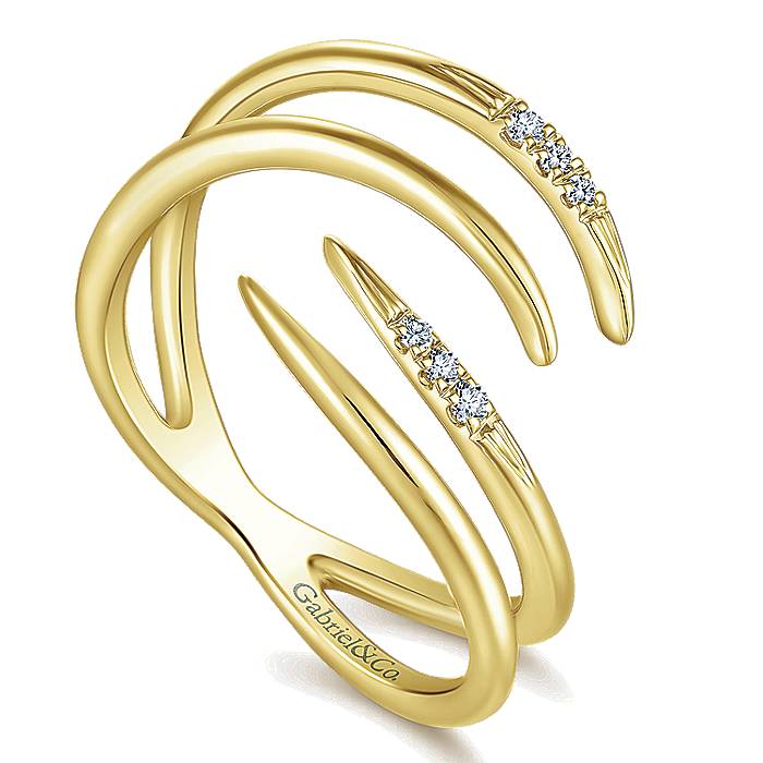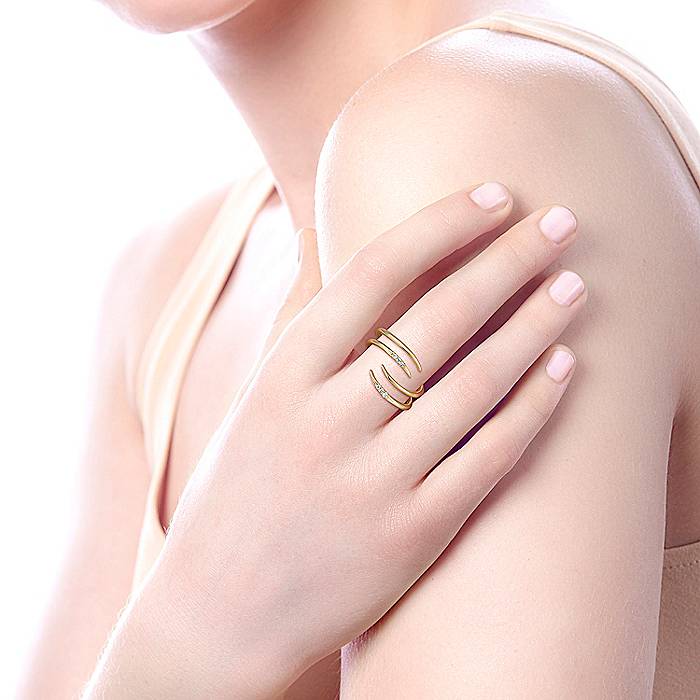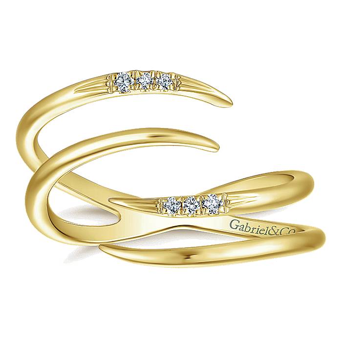 Four Tapered Strands of Polished 14k Yellow Gold And Petite Round Diamonds Layered Fashion Ring