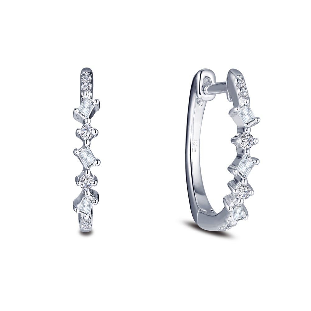 Fun and elegant These baguette and round alternating hoop earrings are set with clear simulated diamonds in sterling silver bonded with platinum