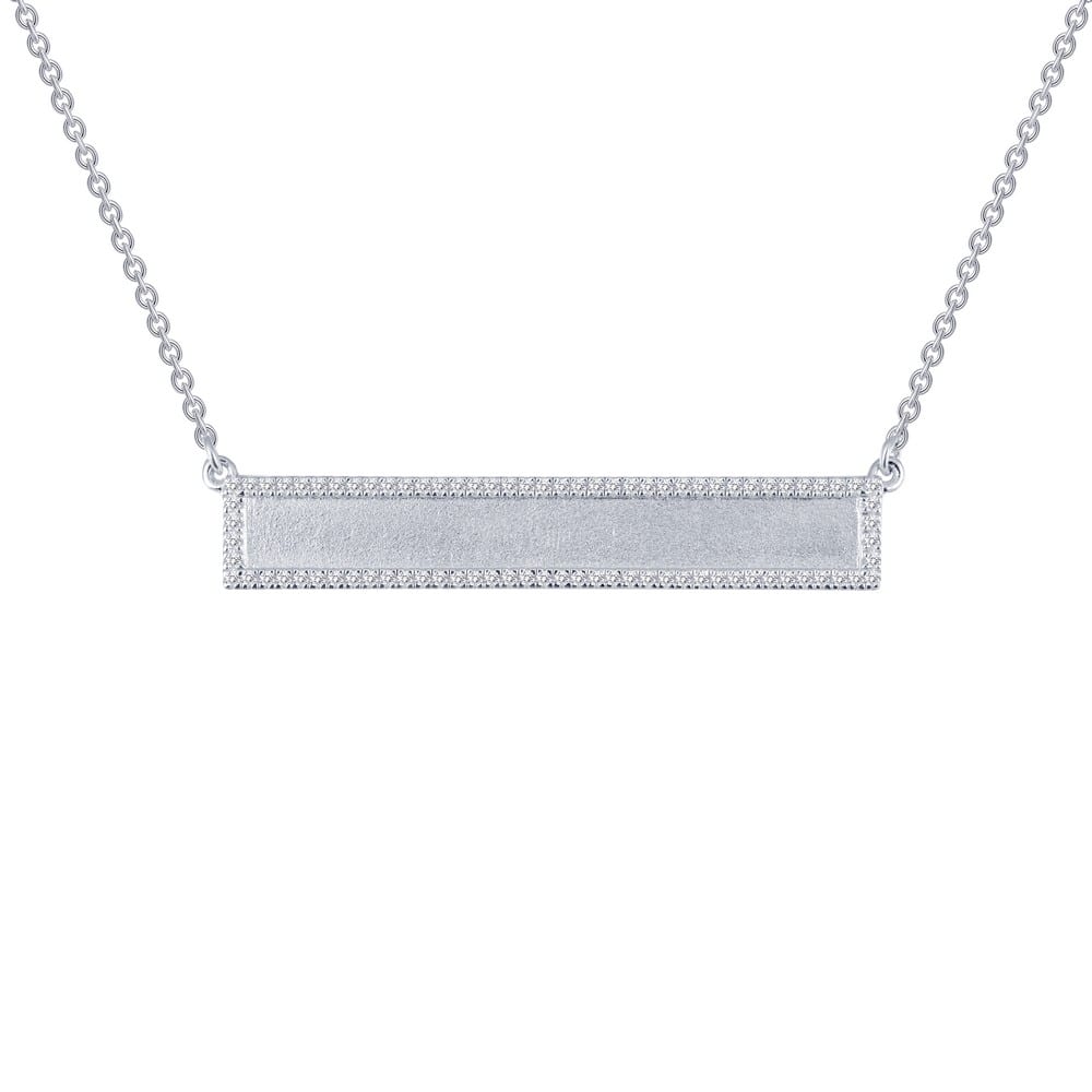 Fun and playful engravable bar necklace is set with simulated diamonds in sterling silver bonded with matt platinum