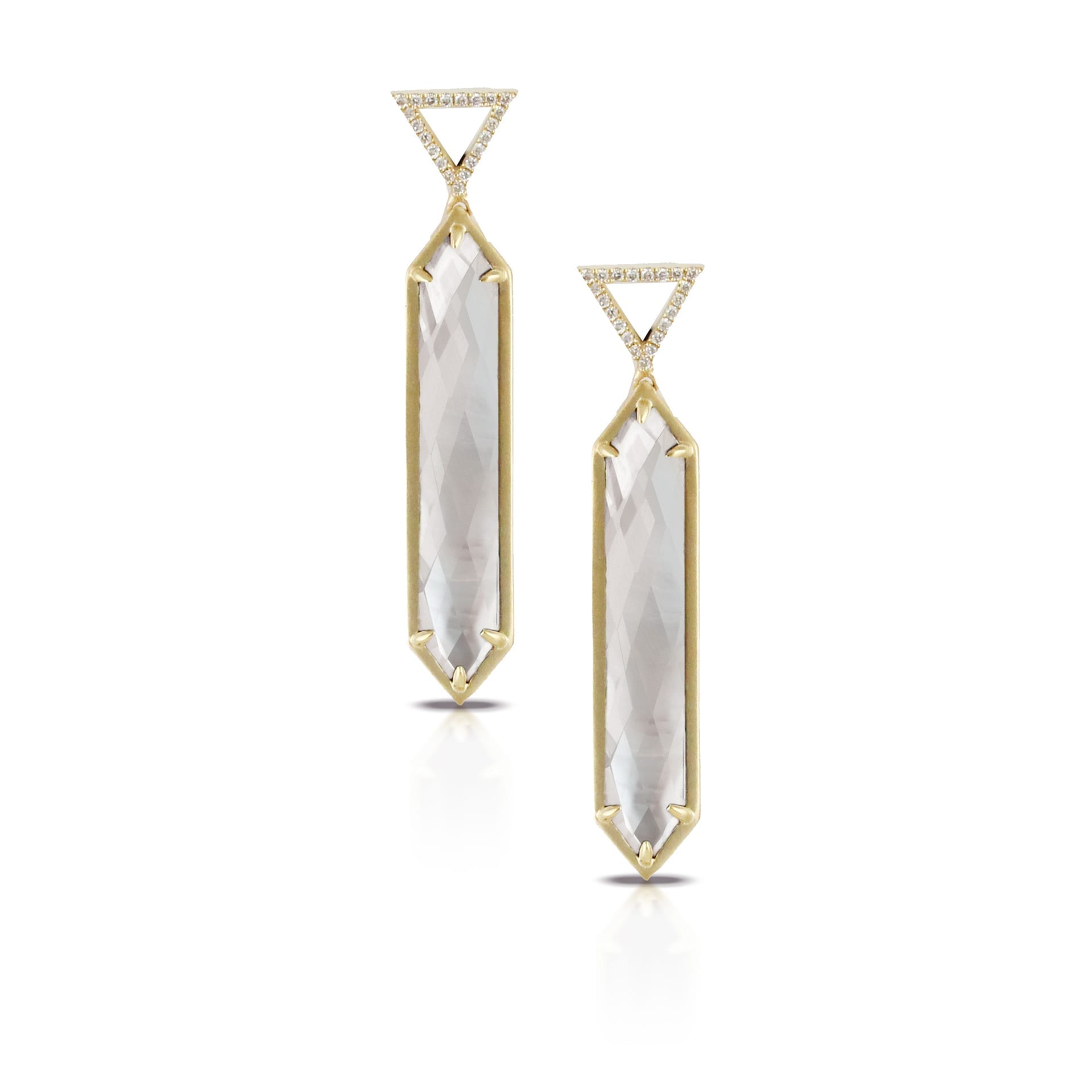 Geometric Clear Quartz Over White Mother Of Pearl Stones Hang From Diamond Encrusted Triangles in 18k Yellow Gold Earrings