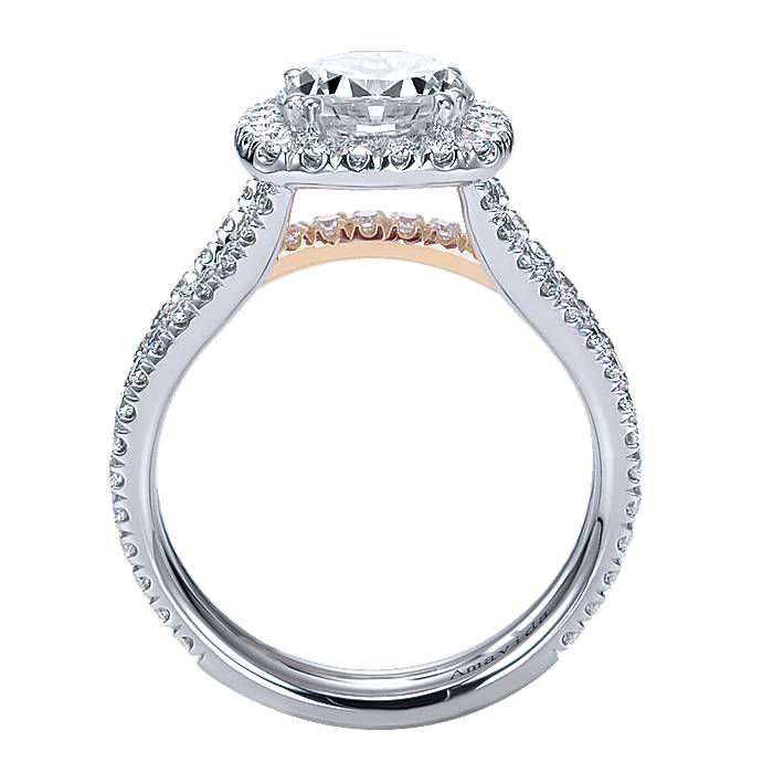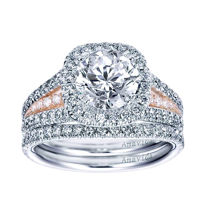 Hand Engraved Milgrain Finish Accentuating Diamond Halo in 18K White and Pink Gold Amavida Engagement Ring