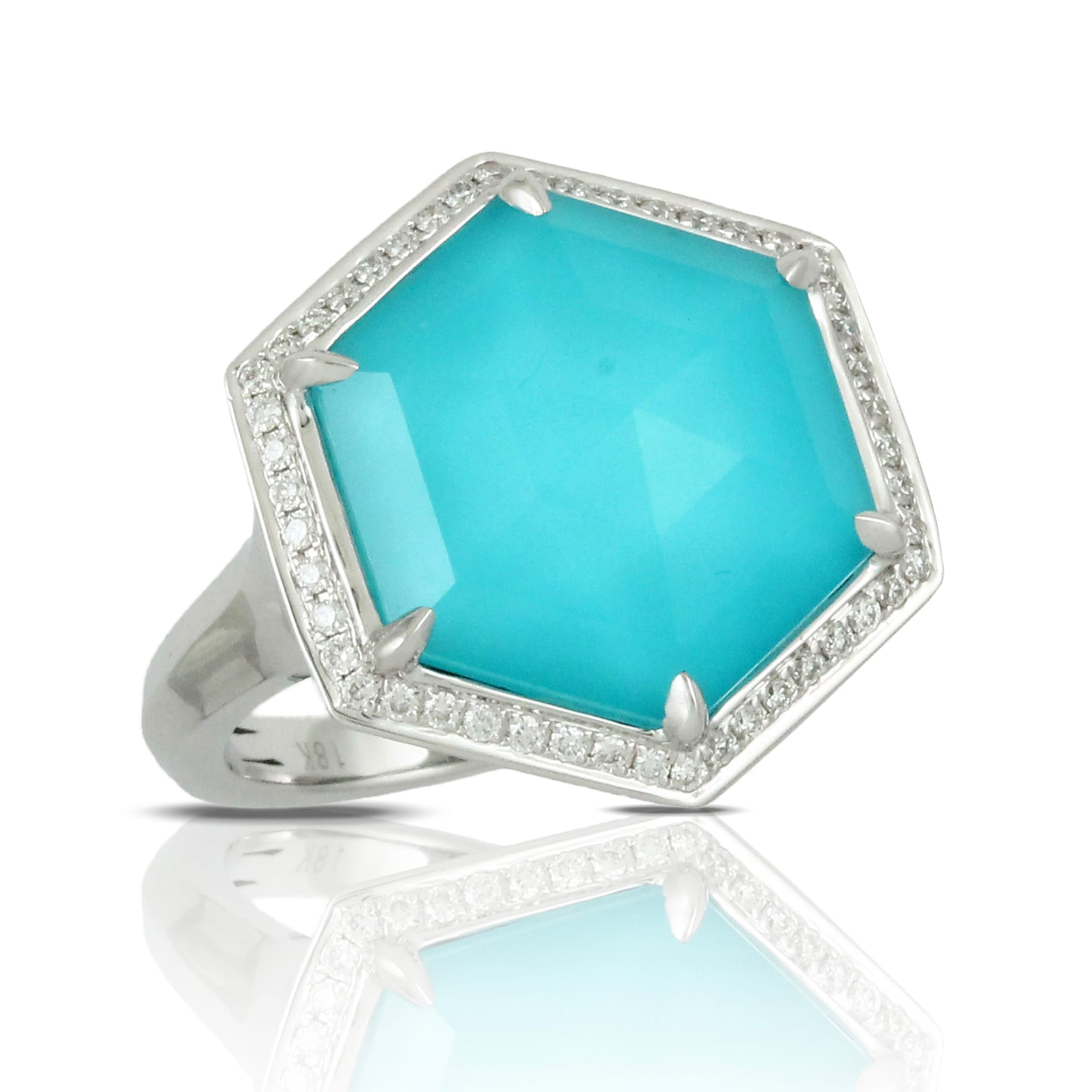 Hexagon 18k White Gold Diamond Ring With White Topaz Over Turquoise