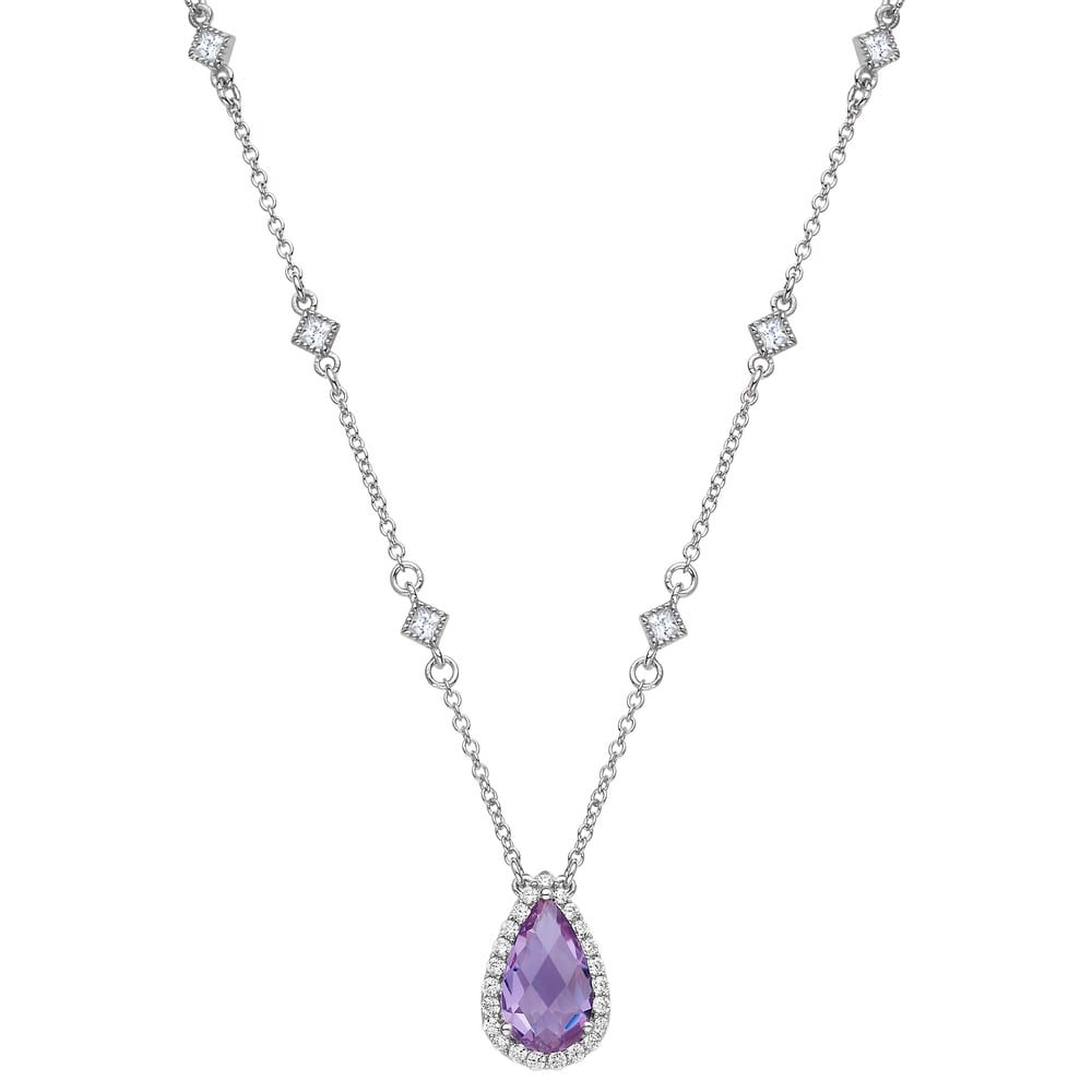 Indulge in the romance of Aria necklace set with a genuine pear-shaped checkerboard-cut amethyst surrounded by simulated diamonds in sterling silver bonded with platinum
