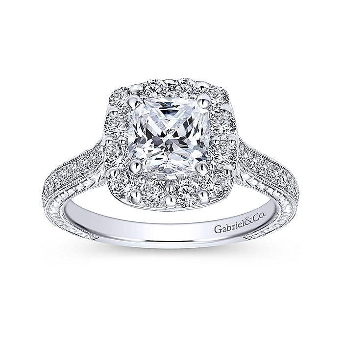 Intricate Hand Cut Etching With Pave Channeled Diamonds on 14k White Gold Engagement Ring Setting