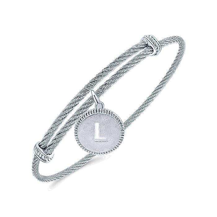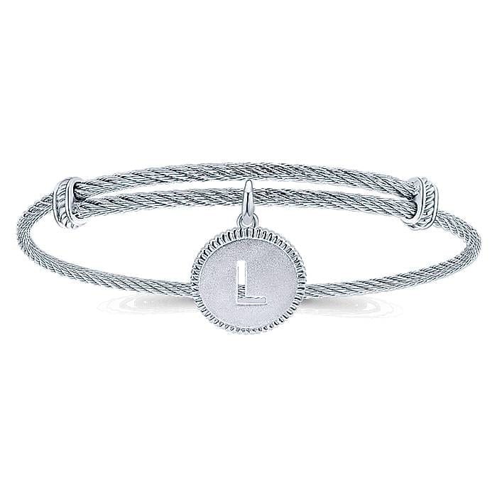 Letter L Initial Centered Round Charm on 925 Sterling Silver and Stainless Steel Adjustable Bracelet