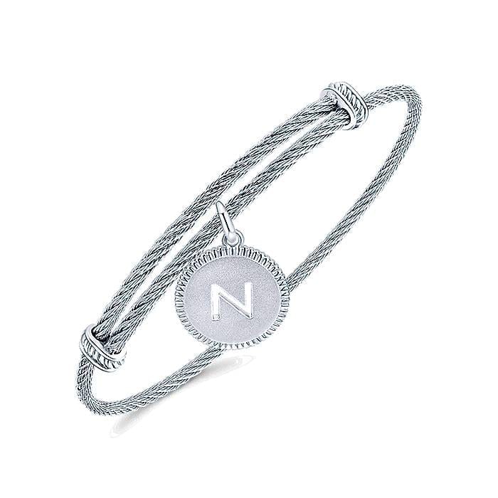 Letter N Initial Centered Round Charm on 925 Sterling Silver and Stainless Steel Adjustable Bracelet