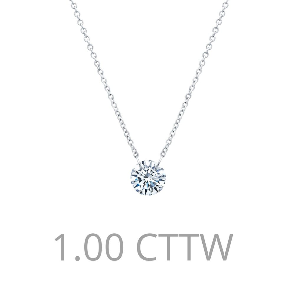 Mesmerizing shimmer classic frameless necklace features a 1 carat simulated diamond in in sterling silver bonded with platinum combined with 14-karat gold components