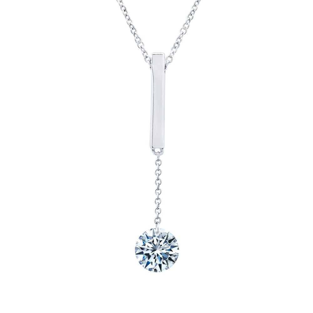 Mesmerizing shimmer frameless necklace features a one-carat simulated diamond on a chain dangled from a sleek bar in sterling silver bonded with platinum combined with 14-karat gold components