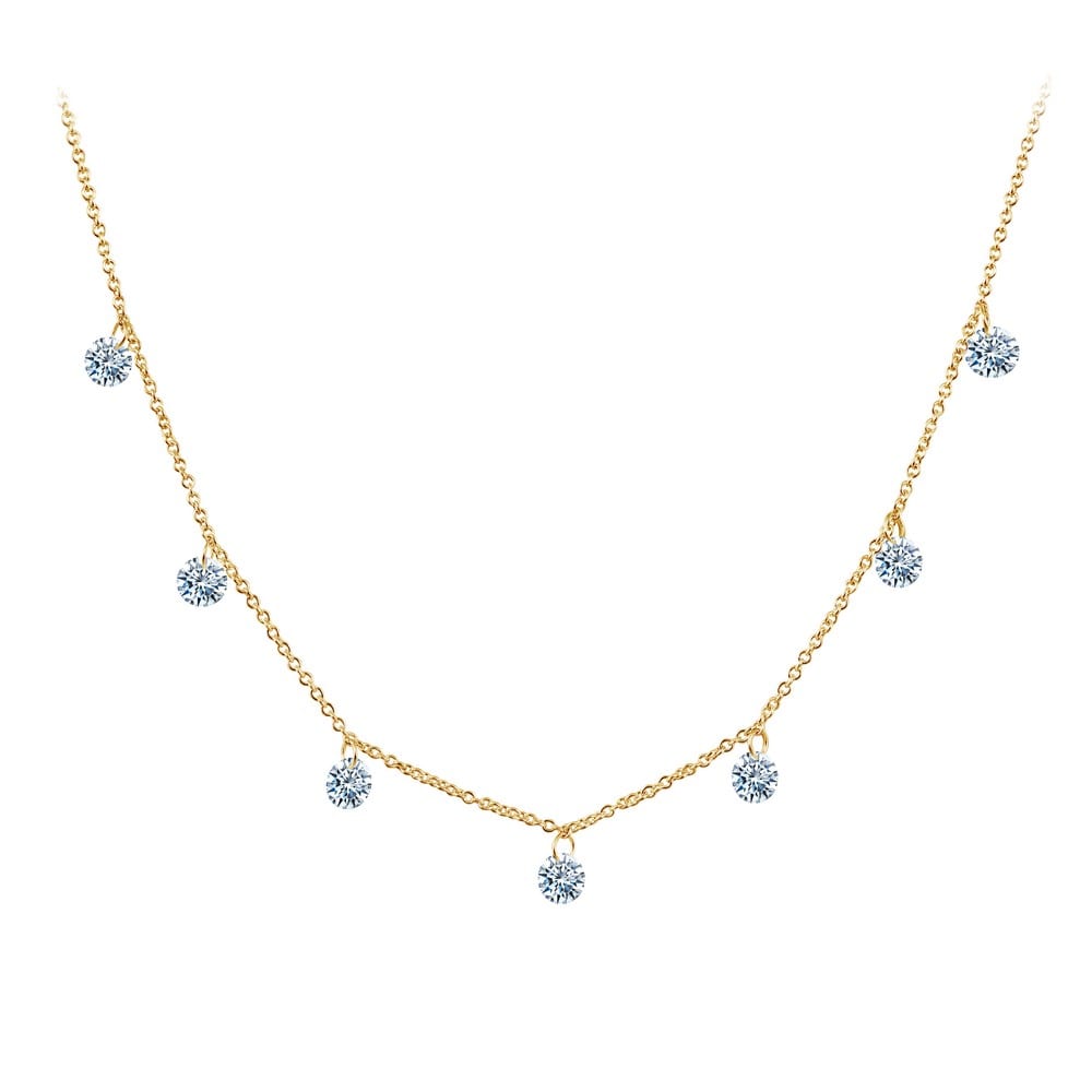 Mesmerizing shimmer frameless raindrop necklace features 7 simulated diamonds dangled on a chain in gold-plated sterling silver combined with 14-karat gold components