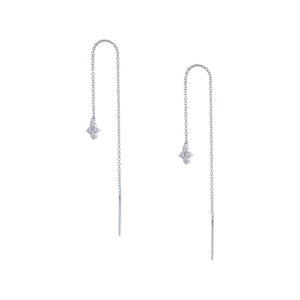 Minimalist elegance Each of these elegant threader drop earrings features a small flower cluster set with simulated diamonds in sterling silver bonded with platinum