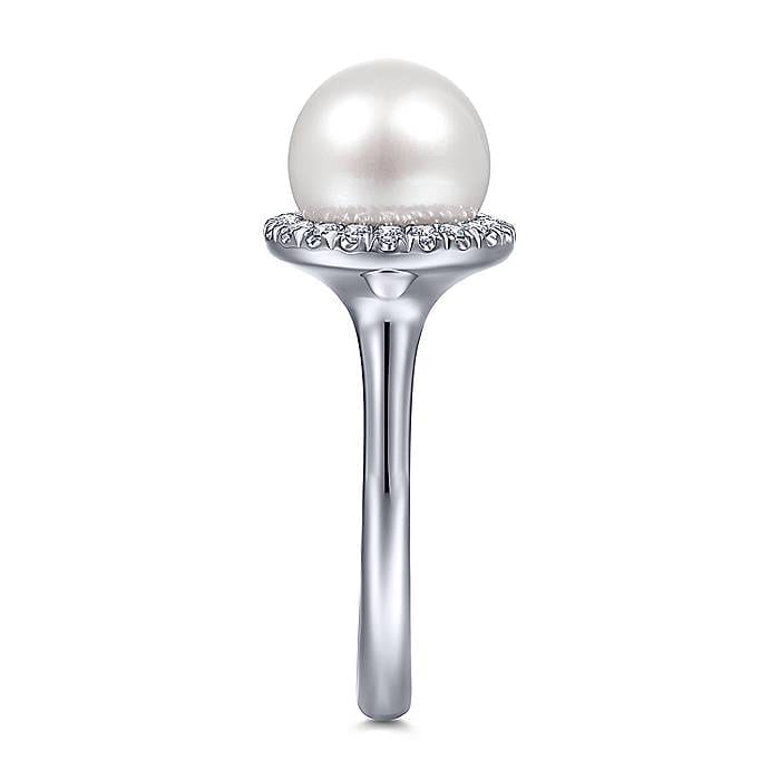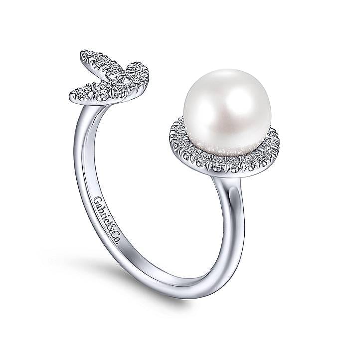 Open Ring With Cultured Pearl in Diamond Halo and Trio of Radiant Petals in 14k White Gold